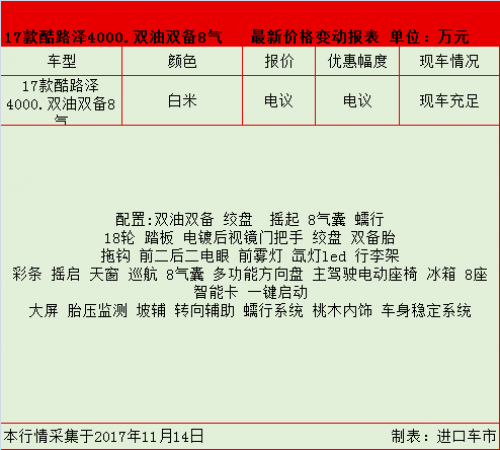 进口车市:丰田酷路泽4000是丰田汽车旗下的大型SUV车型,强悍的越野性能力,保证你在极限环境下能维持正常运转。酷路泽依靠其无可挑剔的品质、彪悍的越野性能和出色的可靠性耐久性,甚至威胁了路虎这样的顶级越野车制造商。